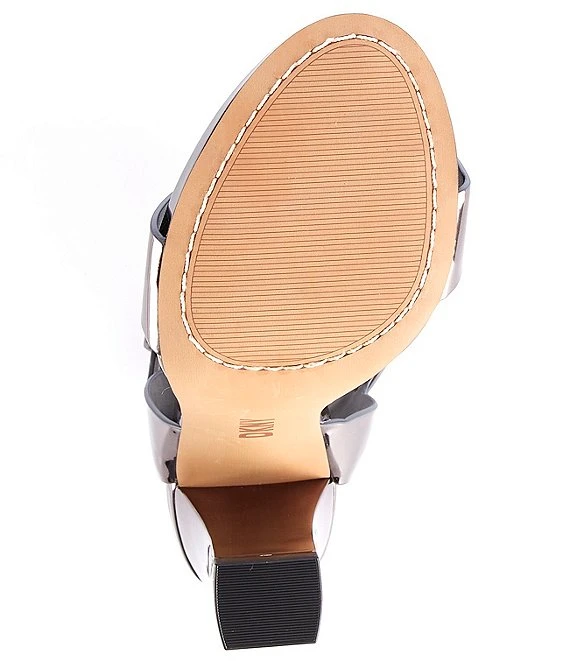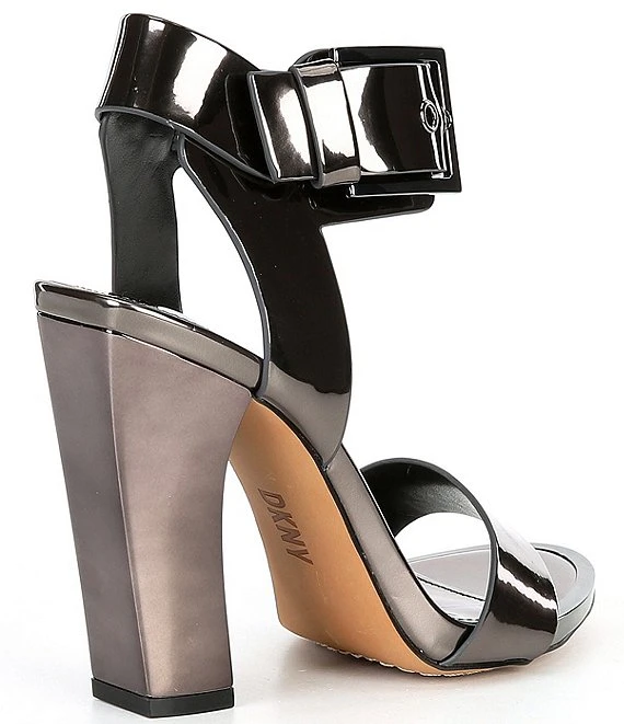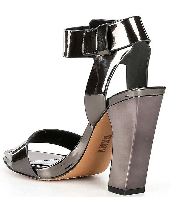 From DKNY, the Terah Patent Metallic Leather Block Heel Dress Sandals feature: