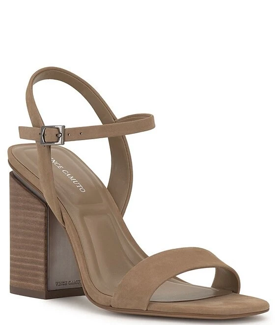 From Vince Camuto, the Herrica Nubuck Stacked Heel Sandals feature: